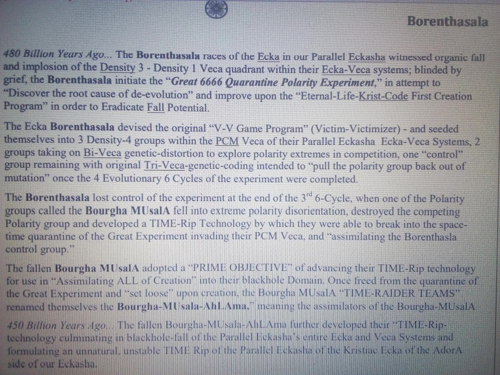 At this time in another Universe a group of extra-dimensionals called the Bourgha-Mu-sa-la, Budhara Shan-Tar-Els (Annu-Elohim fallen Lyrans) and THE-tans (Odedicron reptilians) fell into a black-hole AdonI system due to genetic digression from the Krist Code and the black-hole’s gravitational pull. In the beginning, these beings were pure, sacred and good and lived together with the Rainbow 🌈 Krystal Eukatharaista Beings (Rainbow RoundTable and Haah-Turs) from Inner Hub Worlds (Ekasha-Aah Universe beyond Ecka-Veca systems within the Time Vector Matrix) but when they got corrupted and possessed by other older, more intelligent and more powerful beings from Andromeda called the Chimera they lost their Christiac Minds or specifically the 12th DNA strand which used to activate the Diamond Sun power for Krystal self-regeneration and bio-regenesis keeping them in that dimension (Avatar-Dolar Matrix).