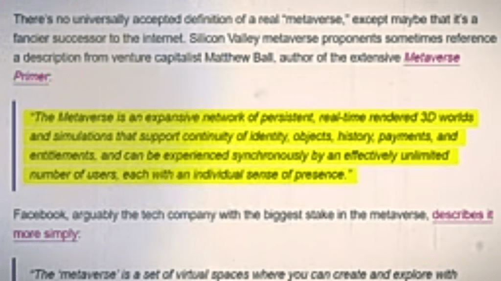 Metaverse is a contraction of the Greek word Meta which as an adjective means”effective” or as a noun is simply “a self-referential boundary marker” and Verse as in “Universe.” Meta is a computerized code which is a (HyperText Mark-up Language) HTML element for a webpage metadata where metadata is simply data that describes other layers of data serving as an informative label and tells the computer how to layout contexts on a screen. The first website called Web 1.0 began in 1991 with nothing more than just uninteresting text and hyperlinks which if clicked upon directed the user to more webpages with more text. Today, we have Web 2.0 which comprises of texts, images, gifs and videos which are more interactive and are community-based via social media, discord channels, podcasts and forums.
